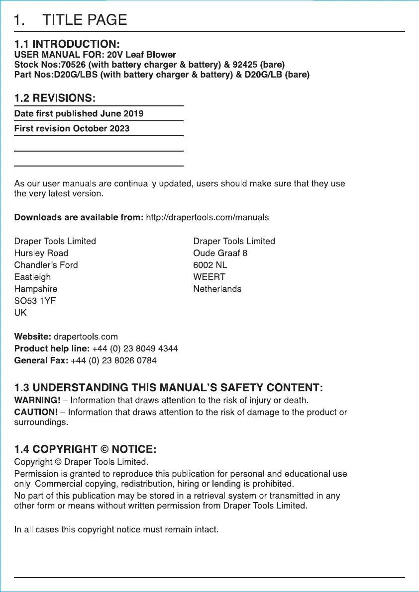 Draper D20 70526 Bruksanvisning