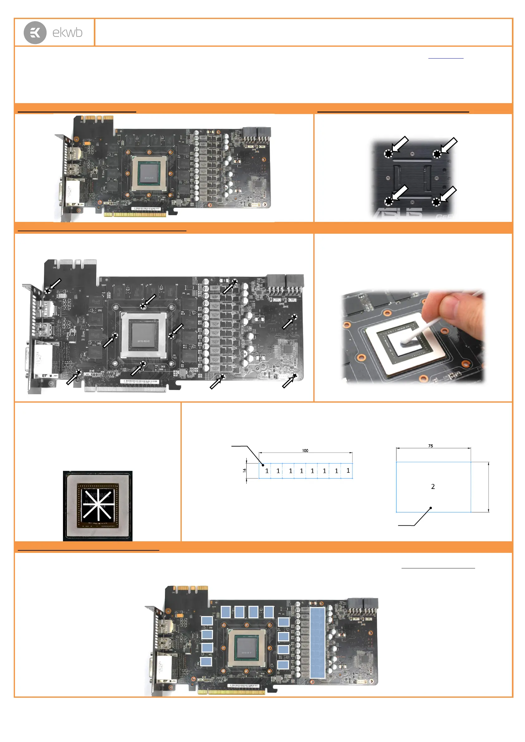 1. PLACING THERMAL PADS ON PCB. Place thermal pads on chips so that numbers on chips match size of thermal pads. EKWB made sure users have more than