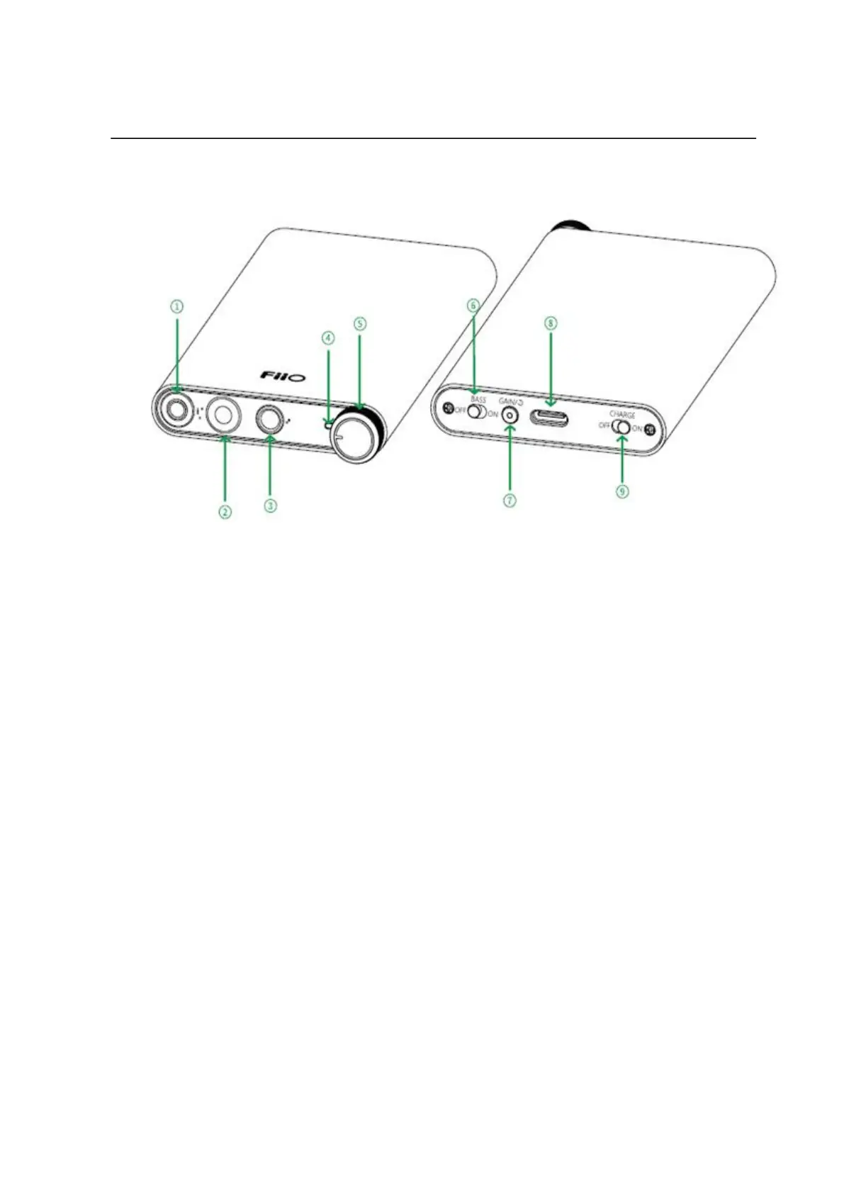 ② 2.5mm balanced headphone output ⑦ Gain/Filter/Reset button/Green