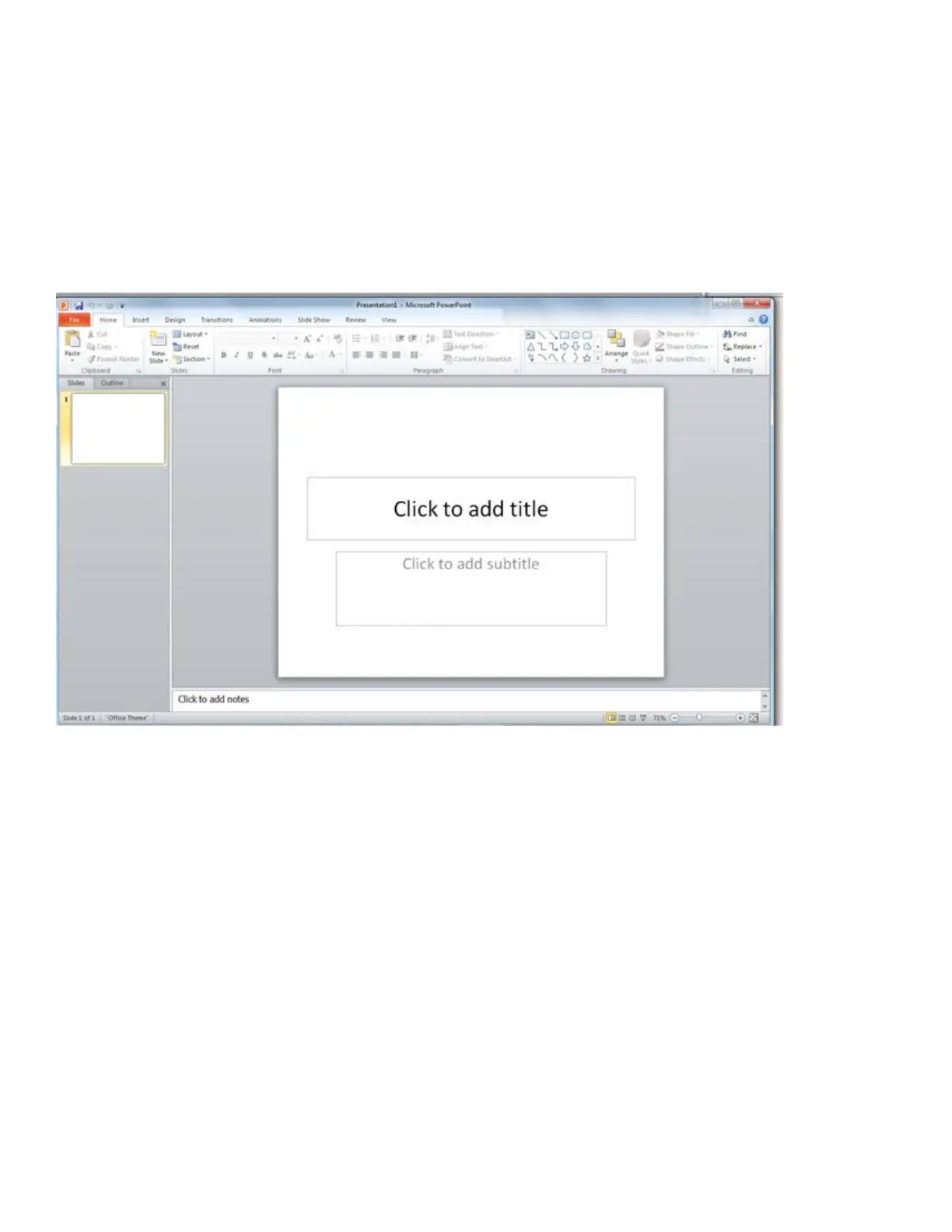 By default, PowerPoint 2010 applies the Blank Presentation template, which appears in the previous illustration, to