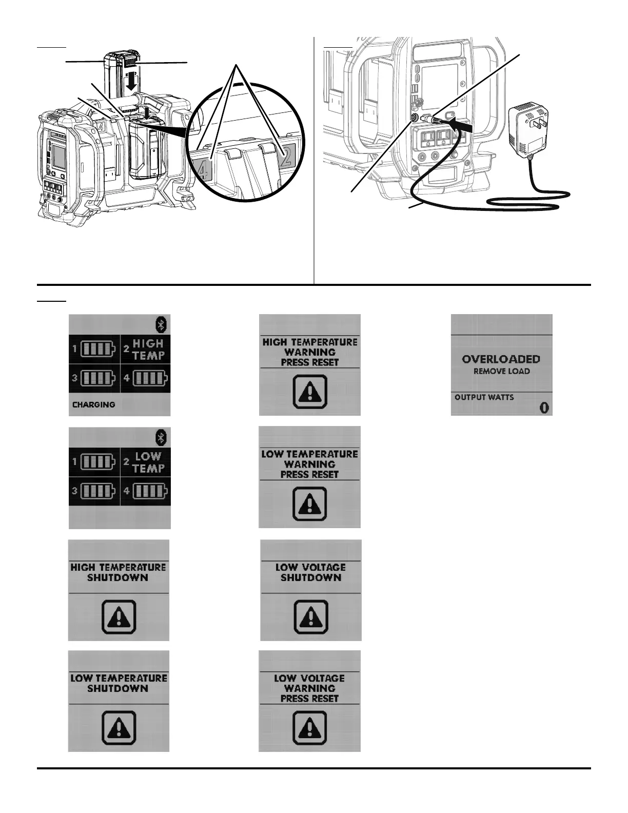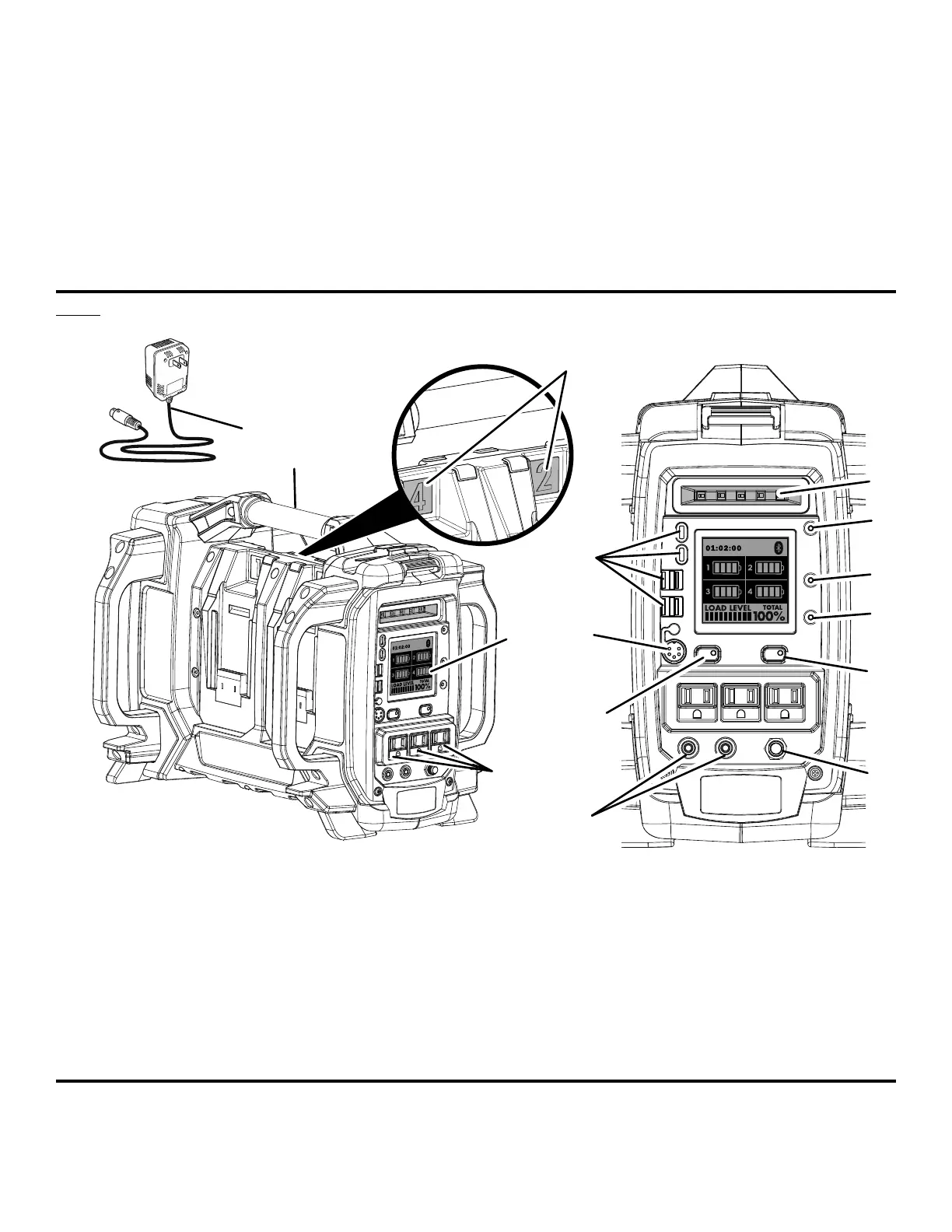 B - Battery ports (ports de batterie, puertos de baterías)