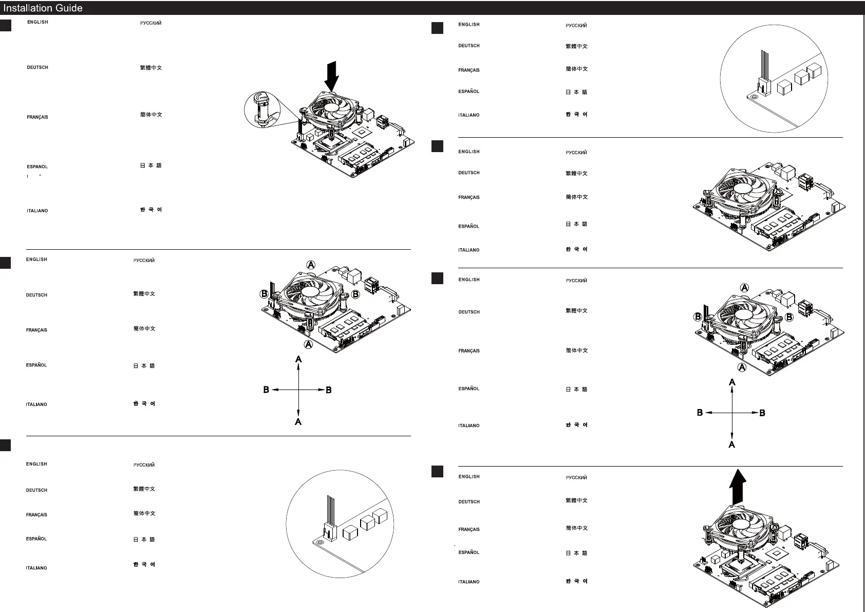 CPUクーラーは、図のようにAの位置にネジ2本で固定し、