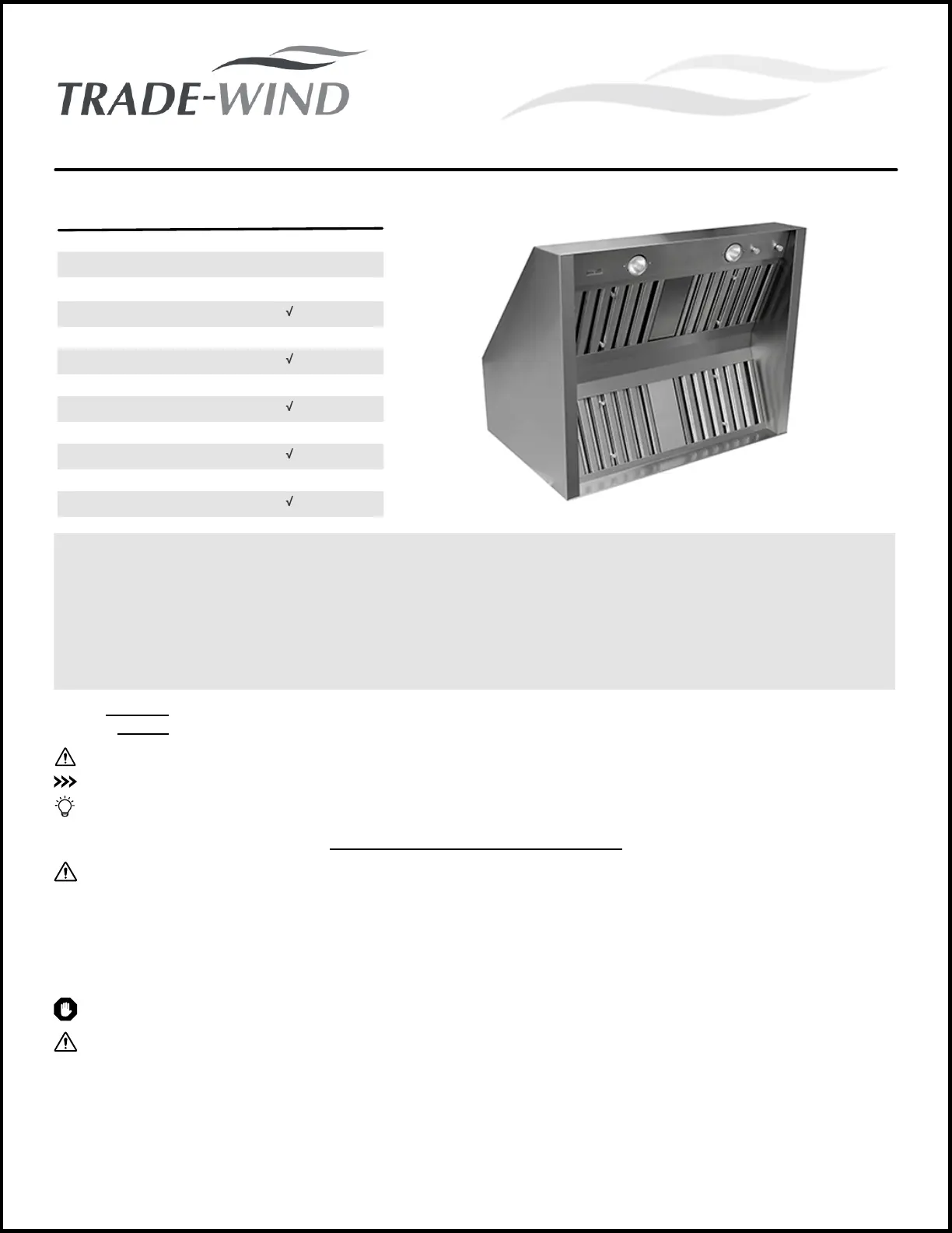 Please be advised that the TRADE-WIND® 7200 Series BBQ Hood MAY NOT be installed on a Patio or Lanai area that does not have
