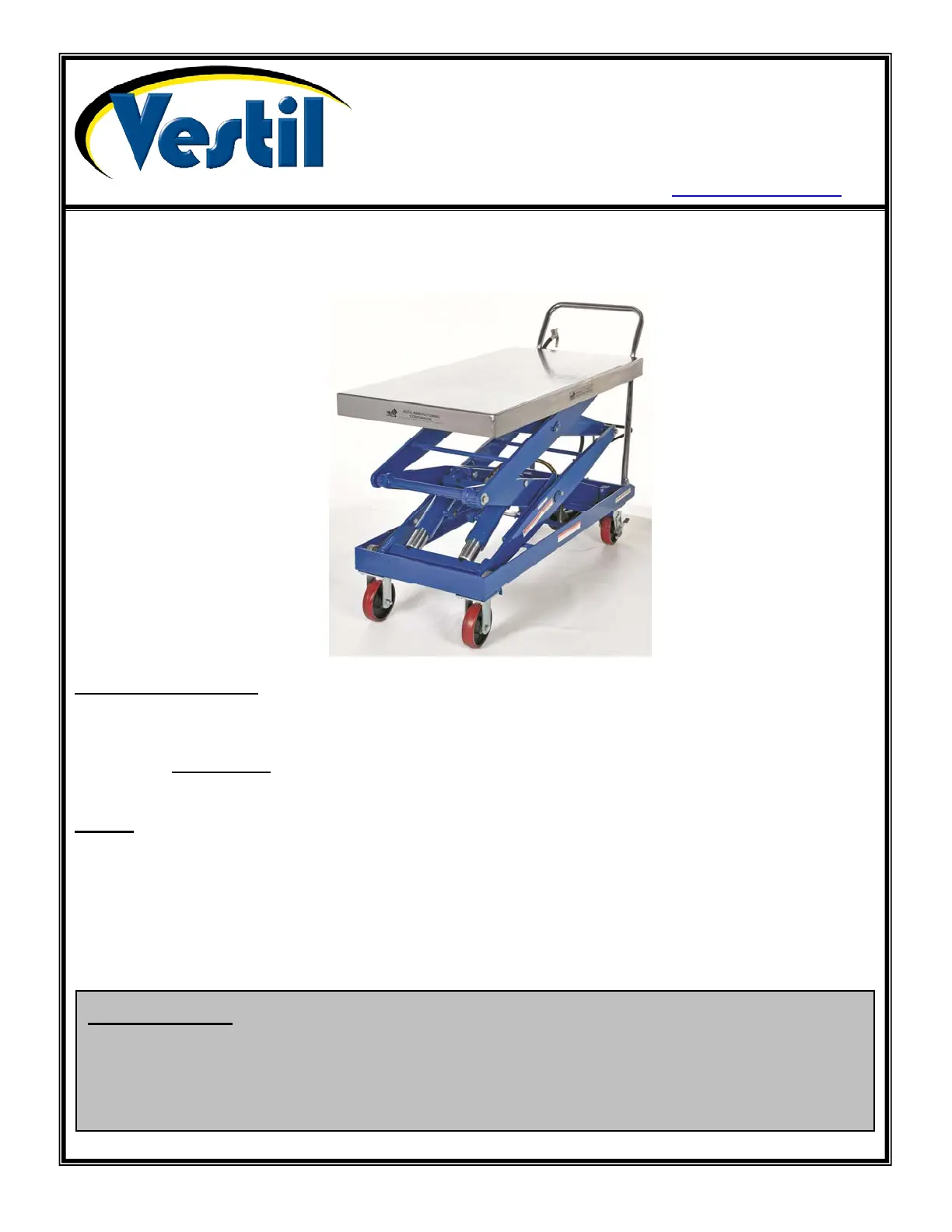 DO NOT modify the product in any way UNLESS you first obtain written approval from Vestil. Unauthorized