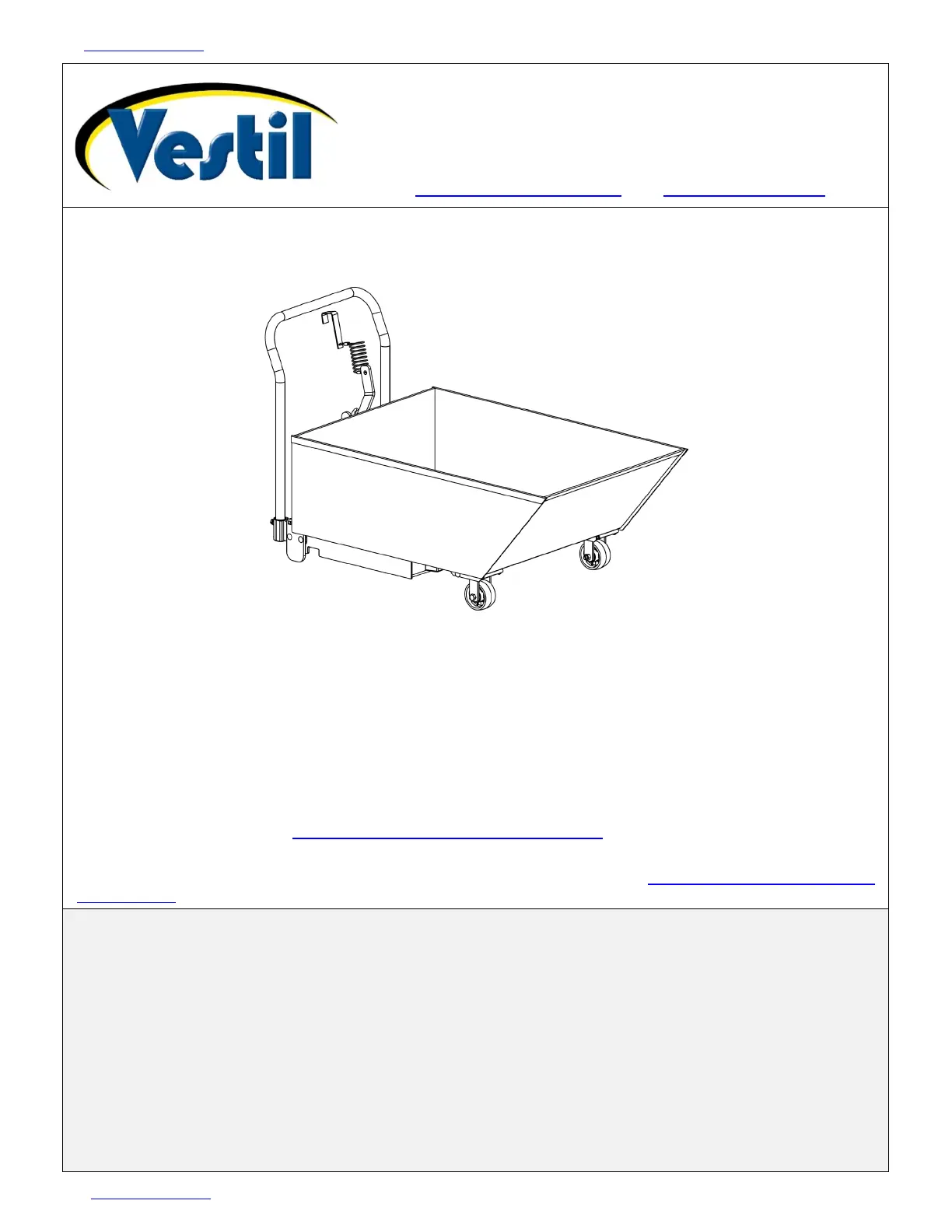 anyone who visits Vestil’s website. Specifications include dimensions, net weight, and capacity