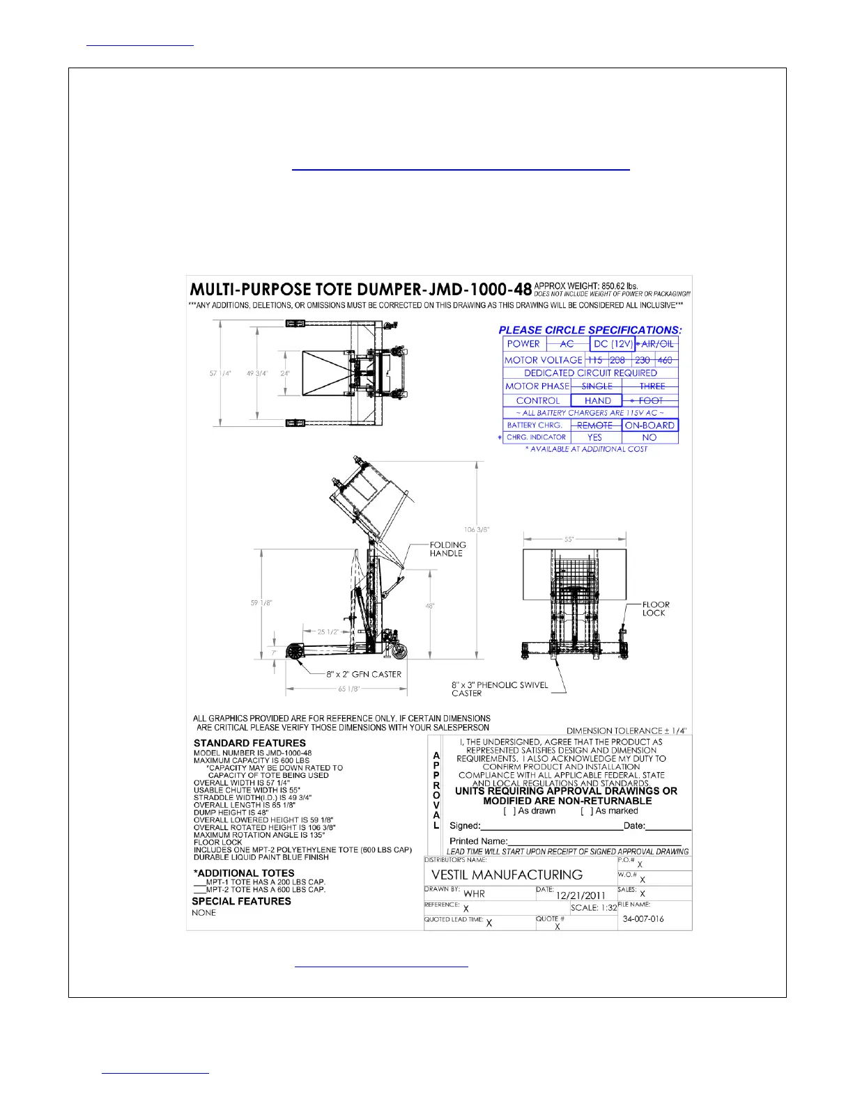 available online to anyone who visits Vestil’s website. Specifications include dimensions, net